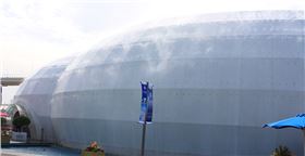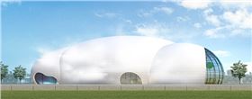 根據(jù)世界氣象組織、地球觀測組織、歐洲氣象衛(wèi)星應(yīng)用組織的設(shè)計要求,2010上海世界氣象組織館似“云中水滴”,由四個扁圓球體結(jié)合而成,形如云狀;外墻采用亮白色膜結(jié)構(gòu),膜布上噴霧點全部開啟時,整個建筑如一團云霧,陽光合適時展館周圍將出現(xiàn)彩虹。場地周邊為淺水池,建筑“漂浮”在水池中央。建筑設(shè)計充分融入了節(jié)能減排理念,采用的材料可全部回收再利用。外層膜結(jié)構(gòu)和霧狀噴泉設(shè)計可以起到降溫、節(jié)能、環(huán)保的作用,堪稱“會呼吸的皮膚”,場館長50m,高12.8m。