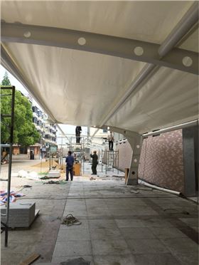 東吳鋼結構為初級中學建造的膜結構停車棚今天開始拉膜。膜結構停車場的篷布材質是膜結構,而膜材的最大特點是強度高、耐久性好、防火難燃、自潔性好,不受紫外線影響,使用壽命長,一般15-30年。具有高透光率,透光率為13%,對熱能反射率73%,熱吸收量很少。正是因為這種劃時代的膜材料的發(fā)明,使膜結構停車場成為現(xiàn)代化的永久建筑。