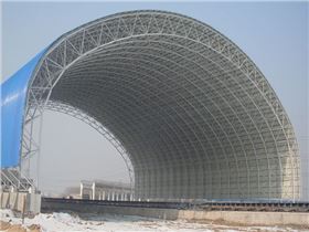 大型干煤棚網(wǎng)架安裝方法由從前的滿堂腳手架高空散裝、累積滑移法、條塊提升結(jié)合高空散裝法到改進(jìn)到“基準(zhǔn)跨提升結(jié)合高空錐體散裝法”進(jìn)行施工。大型鋼網(wǎng)架的安裝一般采用滿堂腳手架胎架支撐法、整體提升法、滑移胎架支撐法。“滿堂腳手架胎架支撐安裝法”因?qū)龅匾蟾?,安裝措施費(fèi)用高,在大型鋼網(wǎng)架安裝中已經(jīng)較少采用;“整體提升法”因?qū)ΜF(xiàn)場安裝占用場地時(shí)間長,常常無法滿足于土建的設(shè)備安裝的交叉施工;“滑移交叉支撐安裝”需要搭設(shè)部分滿堂腳手架或滑移用的網(wǎng)架,鋪設(shè)滑移軌道,對胎架強(qiáng)度、剛度、穩(wěn)定性要求高,用鋼量較大,對于軟基地還需對滑移軌道基地進(jìn)行預(yù)處理,造價(jià)相對較高。