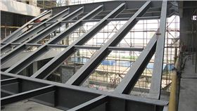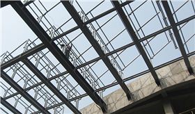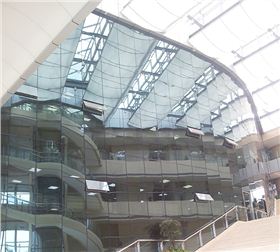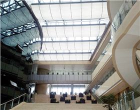 其中大型鋼結構玻璃采光頂由2榀大小不一的鋼結構主次梁形成整體結構,在結構之上用方管龍骨做成鋸齒形狀,玻璃采用中空夾膠玻璃,結構下部設電動遮陽簾,可根據采光需要自動展開、收縮遮陽簾,這樣既保證了采光的需要,又考慮了節(jié)能的效果,晴天從內部向上看去,藍天白云盡現眼前。