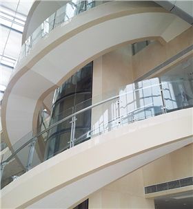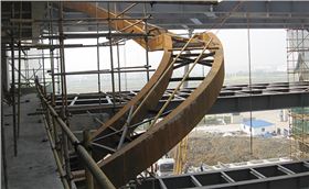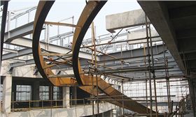 最讓人驚嘆的是辦公樓中從土建結構梁外側懸挑半徑14米的板式鋼結構大型旋轉樓梯,將升降電梯環(huán)抱與當中,梯梁又四塊板根據空間弧度放樣焊接而成,鋼板焊接均需采用全剖口焊接,旋轉樓梯外貼花崗巖,本工程設計翻樣、施工放線均存在技術上難度,需要所有技術人員及管理者共同參與,造就了華潤包裝材料有限公司氣勢磅礴的板式旋轉樓梯。