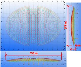國內(nèi)某體育館網(wǎng)架工程,橢球造型,長軸78m,短軸57m,矢高3m,中間部分矢高2.2m,如圖一所示。現(xiàn)需要增加特殊用途,增加馬道若干條。經(jīng)方案比選,最終確定采取在原有網(wǎng)架網(wǎng)格中新建小型穿心網(wǎng)架(嵌套網(wǎng)架)的方案。