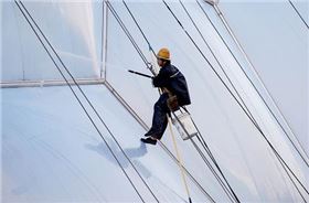 膜面在潮濕狀態(tài)下會(huì)很滑,因此應(yīng)使用安全繩及防墜網(wǎng)等安全措施。考慮到在清洗老舊建筑時(shí)可能發(fā)生斷裂等破壞,故應(yīng)在其下布置安全網(wǎng)。