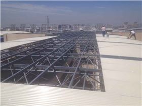國際商貿(mào)城屋頂頂由5個(gè)小的弧形網(wǎng)架構(gòu)成,最終形成H型大網(wǎng)架屋面,該網(wǎng)架結(jié)構(gòu)屋面原設(shè)計(jì)采用0.5mm彩鋼板,甲方提出屋面須有較好的隔音效果,東吳鋼結(jié)構(gòu)秉持著站在為業(yè)主考慮的角度,提出將彩鋼瓦變?yōu)?mm厚的樹脂板,不僅能到達(dá)預(yù)期效果,造價(jià)也在業(yè)主接受范圍內(nèi)。