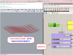 下圖所示即為Grasshopper模型結(jié)構(gòu),通過它就可以隨意創(chuàng)建任意形態(tài)的空間結(jié)構(gòu)網(wǎng)架,完全省卻了人工調(diào)整網(wǎng)格大小和結(jié)構(gòu)高度的時(shí)間。