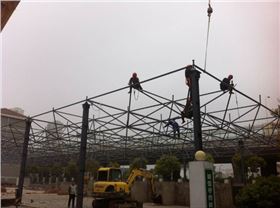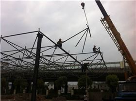 與傳統(tǒng)平面結(jié)構(gòu)相比,網(wǎng)架結(jié)構(gòu)輕巧,能覆蓋各種形狀的平面,又可設(shè)計(jì)成各種各樣的體形,造型美觀大方。網(wǎng)架結(jié)構(gòu)的構(gòu)件,其尺寸和形狀大量相同,可在工廠成批生產(chǎn),且質(zhì)量好、效率高、同時不與土建爭場地,因而現(xiàn)場工作量小,工期縮短,建設(shè)速度快。