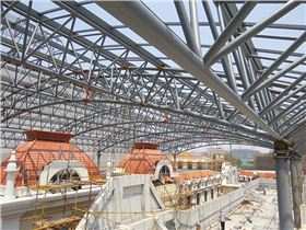 特別提到的是:從迪諾水鎮(zhèn)南廣場一眼看去,東吳鋼構(gòu)施工的鋼結(jié)構(gòu)玻璃頂像一顆顆寶石鑲嵌在綠色環(huán)境中,公交回車場膜結(jié)構(gòu)就像一條白色的龍盤付在景區(qū),C4、C5管桁架玻璃頂就像一個強壯的漢子站在歐式建筑上,為游客遮風(fēng)擋雨,切合了中華恐龍園的主題!