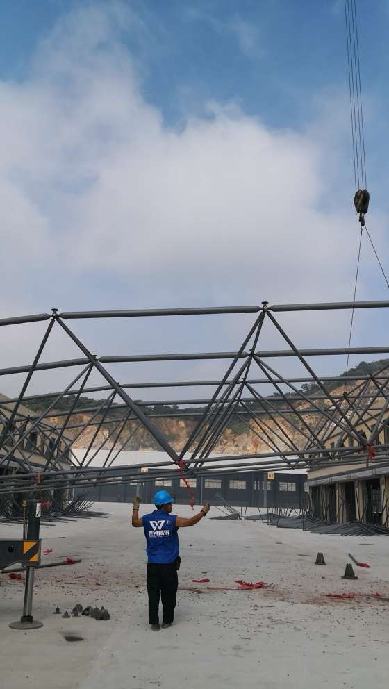 6.逐步檢查網(wǎng)格尺寸,逐步向前推進(jìn)。網(wǎng)架腹桿與網(wǎng)架上弦桿的安裝應(yīng)相互配合著進(jìn)行。