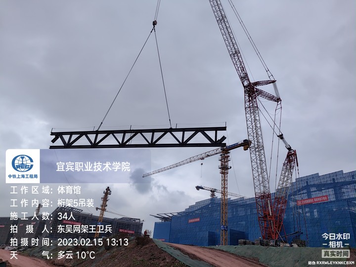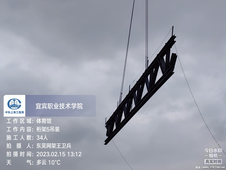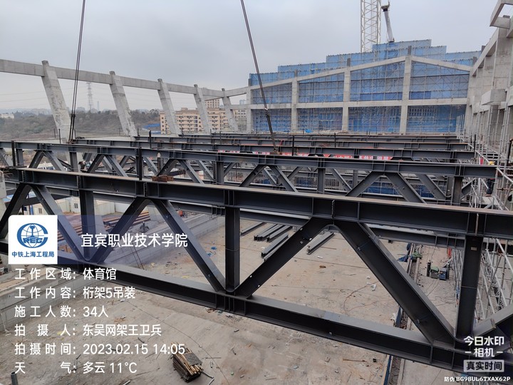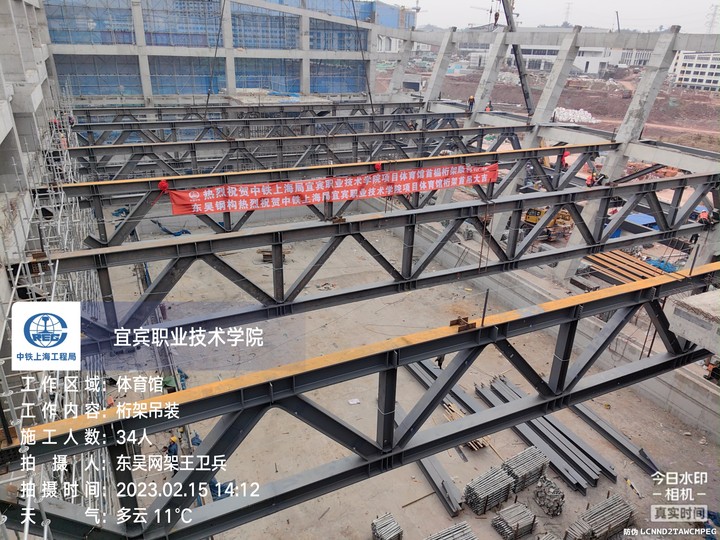 2023年2月15日,宜賓職業(yè)技術(shù)學(xué)院體育館項目施工現(xiàn)場傳來消息,6榀桁架已全部安裝完成,這是一個階段性的勝利,這離不開以中鐵上海工程局指揮長尤恩奎總帶領(lǐng)的項目部主要管理人員的辛勤付出及東吳網(wǎng)架所有小伙伴的通力配合。