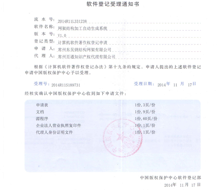 2014年11月17日,對于常州東吳鋼結(jié)構(gòu)網(wǎng)架有限公司來說,又是一個歡喜的日子。今天,我們東吳鋼構(gòu)的《網(wǎng)架結(jié)構(gòu)加工自動生成系統(tǒng)的軟件著作權(quán)》登記已經(jīng)得到中國版權(quán)保護中心軟件登記部的受理,后續(xù)相關(guān)工作正在有序的展開。