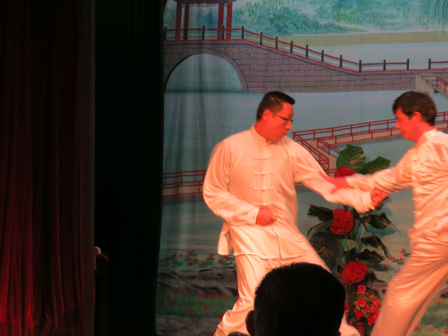 其后,精彩的文藝節(jié)目開始,悠揚的笛子獨奏、奔放的二胡、浪漫的葫蘆絲、高亢的京劇、韻味十足的蘇州評彈等給嘉賓留下了深刻的印象,最后,期待已久的武術(shù)表演開始,五行連環(huán)、八卦掌、五行相生相克、太極拳、太極劍等獲得了觀眾們的陣陣喝彩!