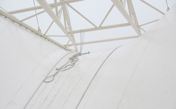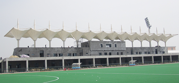 B:中國曲棍球基地主看臺結(jié)構(gòu)由14根鋼柱做到頂部,在看臺上部,每根鋼柱前后分別挑出兩榀管桁架,跨度分別為20m和5m,每榀桁架上均有拉索連接于桁架和鋼柱,鋼柱間由桿件相互連接,形成一個結(jié)構(gòu)整體,結(jié)構(gòu)表面材料為PTFE膜材,整體外形酷似一片片展開大小不一的樹葉,故稱葉片看臺,建筑形式特別新穎。