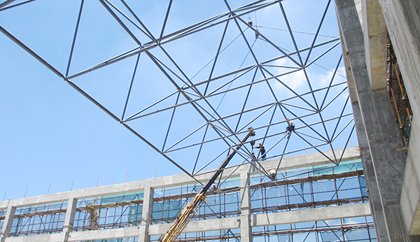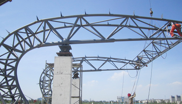 本鋼結(jié)構(gòu)工程不是一個單體工程,而是一批鋼結(jié)構(gòu)工程的組合。包括主看臺管桁架膜結(jié)構(gòu),副看臺為異形鋼結(jié)構(gòu)(管桁架)+鋁鎂錳板屋面,室內(nèi)訓(xùn)練館網(wǎng)架結(jié)構(gòu),培訓(xùn)中心球形網(wǎng)架結(jié)構(gòu),西大門造型鋼結(jié)構(gòu),培訓(xùn)中心框架結(jié)構(gòu)(局部鋼結(jié)構(gòu)夾層),培訓(xùn)中心大型鋼結(jié)構(gòu)旋轉(zhuǎn)樓梯,培訓(xùn)中心大型鋼結(jié)構(gòu)玻璃雨棚等。特別說明的是: