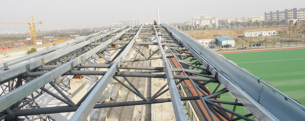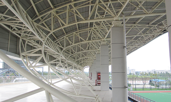 A:中國曲棍球基地副看臺由14榀主桁架,39榀次桁架組成,整體呈現(xiàn)錯落有致的弧形,主桁架有7榀弧度不一致,跨度也不同,最大跨度達(dá)到25m,屋面采用鋁鎂錳金屬屋面板,整體效果形成蜿蜒似的蛟龍盤踞在綠茵場周邊。