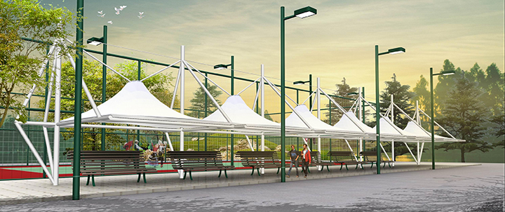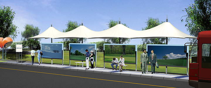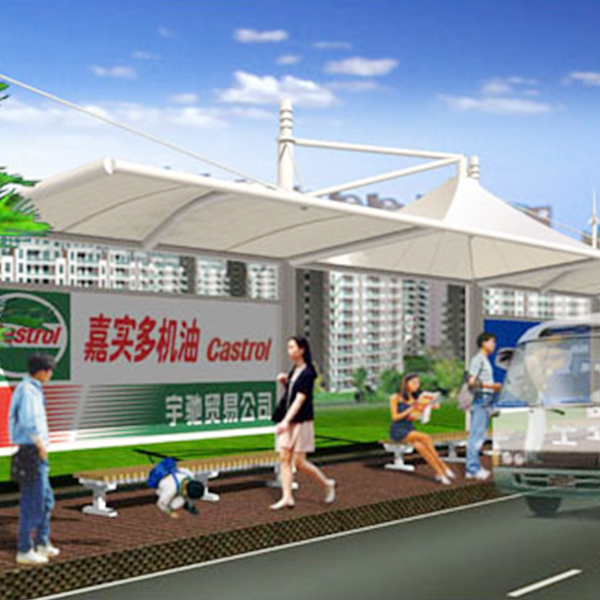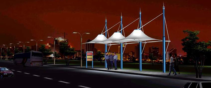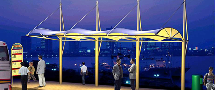 公交站臺(tái)膜結(jié)構(gòu)的膜面是由多種高強(qiáng)薄膜材料通過(guò)加強(qiáng)構(gòu)件(鋼架、鋼柱或鋼索)以一定方式使其內(nèi)部產(chǎn)生一定的預(yù)張應(yīng)力以形成某種空間形狀,作為覆蓋結(jié)構(gòu),并能承受一定的外荷載作用的一種空間結(jié)構(gòu)形式。