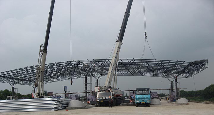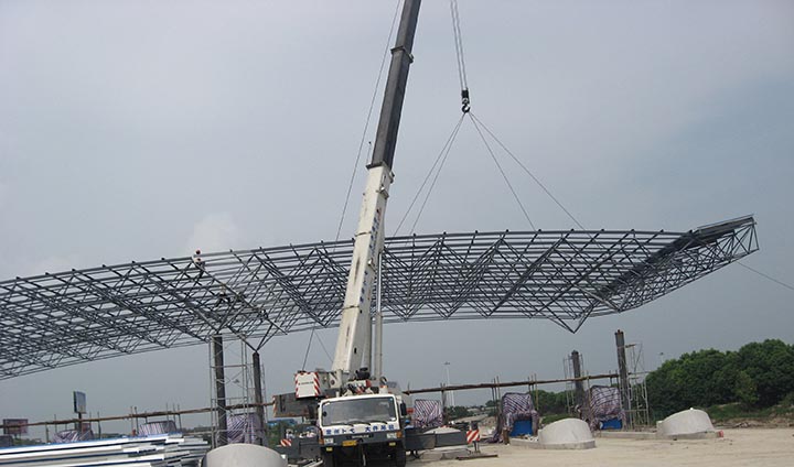 但是,原一級公路收費(fèi)站增補(bǔ)或改造工程一般具有工期短、施工場地小、甚至施工期間需要半幅通車等特點(diǎn),故需要采用合適的結(jié)構(gòu)形式來實(shí)現(xiàn)施工。東吳鋼構(gòu)通過多年的收費(fèi)站施工經(jīng)驗(yàn)積累,建議業(yè)主采用網(wǎng)架結(jié)構(gòu)形式。網(wǎng)架結(jié)構(gòu)工廠化程度高,現(xiàn)場安裝快,可以總體吊裝或者半幅吊裝。