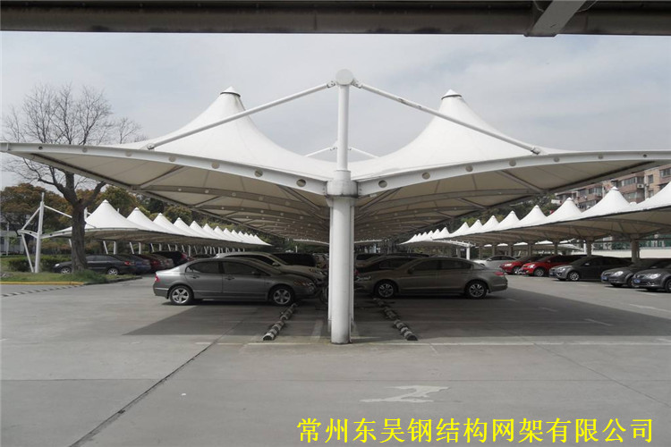 雙懸臂有斜拉膜結(jié)構(gòu)車(chē)棚占用空間小,可以雙面停車(chē),故在需大量停車(chē)的機(jī)關(guān)、醫(yī)院、學(xué)校、公司、廠區(qū)、開(kāi)發(fā)區(qū)、銀行、二手車(chē)市場(chǎng)、商貿(mào)中心等場(chǎng)合會(huì)大面積采用雙懸臂有斜拉膜結(jié)構(gòu)車(chē)棚!