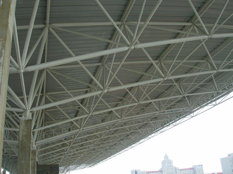 體育場(chǎng)指有400米跑道(中心含足球場(chǎng)),有固定道牙,跑道6條以上,并有固定看臺(tái)的室外田徑場(chǎng)地。場(chǎng)地面積巨大,屋頂通常為通透式的半封閉結(jié)構(gòu)。體育場(chǎng)網(wǎng)架結(jié)構(gòu)的整體性好、剛度大,抗震性能好,能夠創(chuàng)造大跨度無柱空間,在中小型體育場(chǎng)項(xiàng)目中多有應(yīng)用。在大型體育場(chǎng)項(xiàng)目中,需要與其他類型結(jié)構(gòu)形成復(fù)合結(jié)構(gòu)體系,以發(fā)揮各自的優(yōu)勢(shì)。網(wǎng)架零部件經(jīng)過精心、嚴(yán)格的防腐和防火處理后,在使用壽命內(nèi)基本實(shí)現(xiàn)免維護(hù),性價(jià)比非常高。
