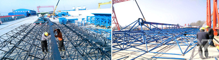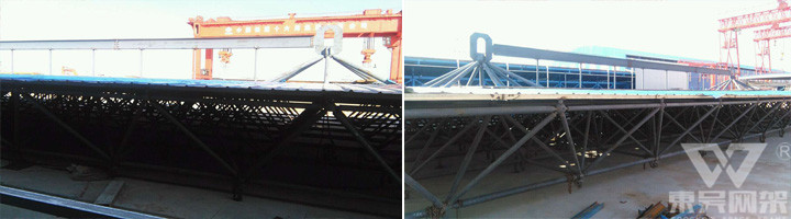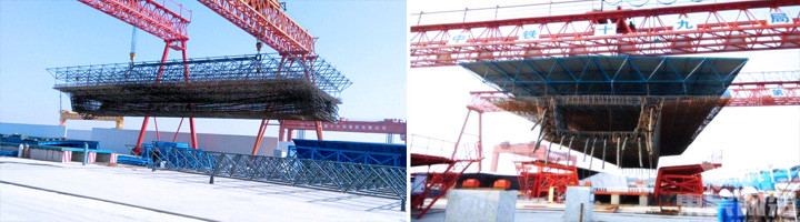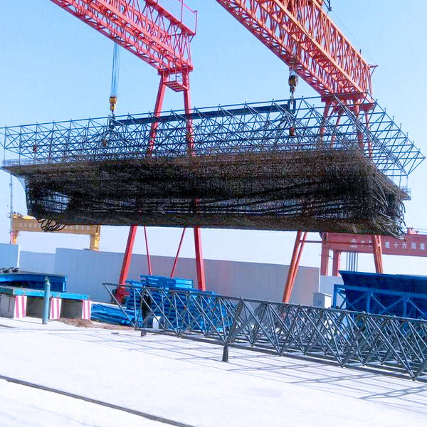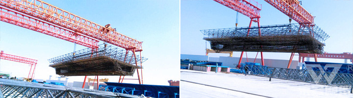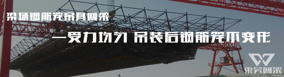 大跨度箱型梁鋼筋籠綁扎好后需要用龍門(mén)吊平移到混凝土澆筑地時(shí)遇到了問(wèn)題,箱型梁一般有32m左右,甚至更長(zhǎng),寬度10m以上,由于鋼筋籠剛度不夠,吊裝過(guò)程中,整個(gè)鋼筋籠會(huì)變形,箱型梁的鋼筋綁扎密密麻麻,變形后恢復(fù)成正常會(huì)浪費(fèi)大量的人力物力。故需要一個(gè)剛度很好、自重很輕、吊點(diǎn)很多的吊具轉(zhuǎn)換平臺(tái)。東吳網(wǎng)架根據(jù)多年積累的經(jīng)驗(yàn),專(zhuān)門(mén)為制梁場(chǎng)定制了鋼筋籠吊具,得到了大面積的使用。